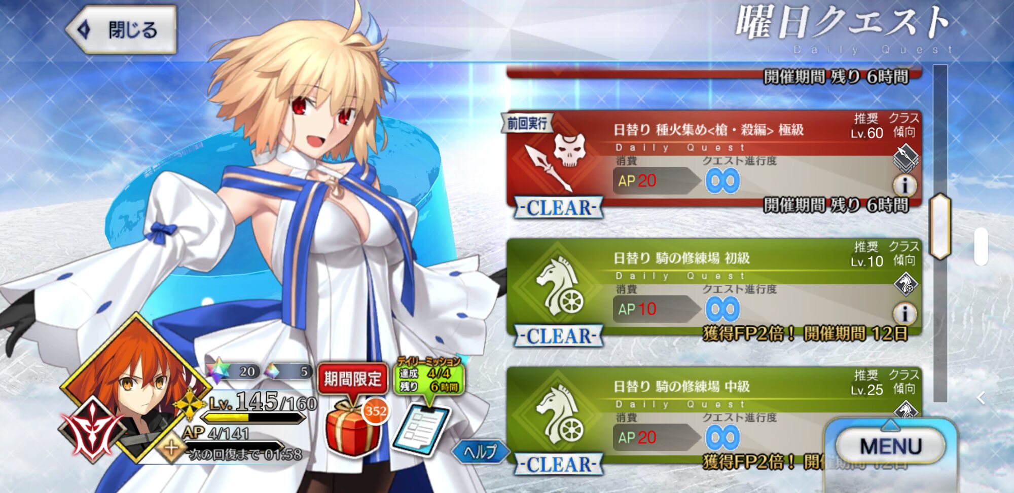 デイリーだけはやって、マナプリだけは集めとけば、いざって時の種火には困らないとは思う。