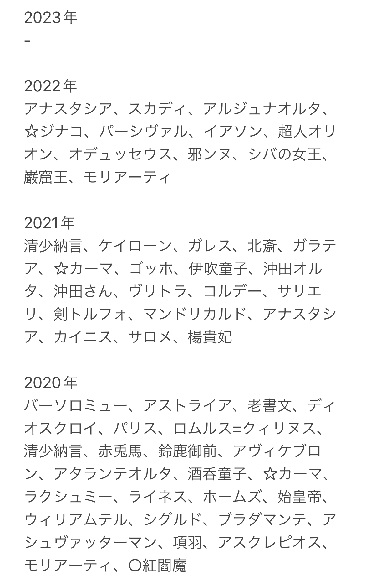 ぐだ邪ン、ぐだメル、ぐだエレ、ぐだシャル、ぐだアナ、ぐだアルキャス、ぐだモル、ぐだメリュ、ぐだカマ、ぐだ沖、男主死神、ぐだトラ、ぐだ壱、ぐだ駒、男主太陽、ぐだアース、男主獅子